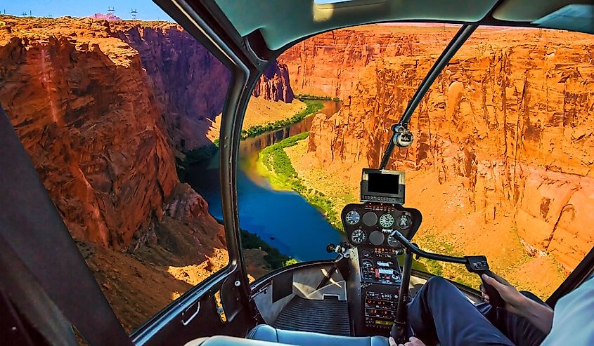 ヘリコプターのコックピットグランドキャニオン湖パウエルを見渡し、ユタとアリゾナの国境にまたがっています。