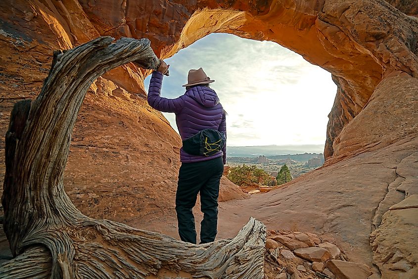 トレイルは日陰ではなく、難しいと考えられています。したがって、ハイカーは、良い靴と通気性のある衣服を着て、たくさんの水を持参することをお勧めします。または、バランスの取れた岩や窓などのハイライトを備えた快適さの景色を楽しむために、18マイルのアーチの風光明媚なドライブで風光明媚なドライブを利用してください。