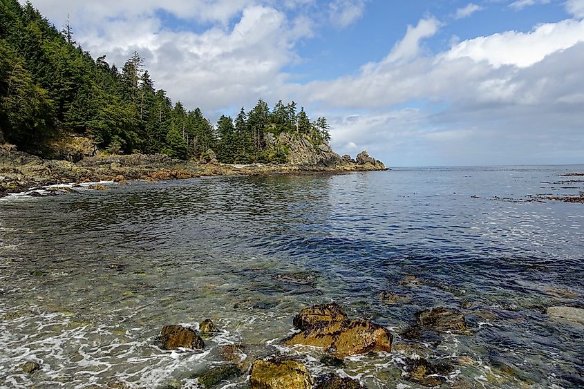 カナダ、ブリティッシュコロンビア州ハイダ・グワイのグワイ・ハーナス国立公園保護区にある、森ときれいな海水に囲まれた美しいビーチの美しい景色。