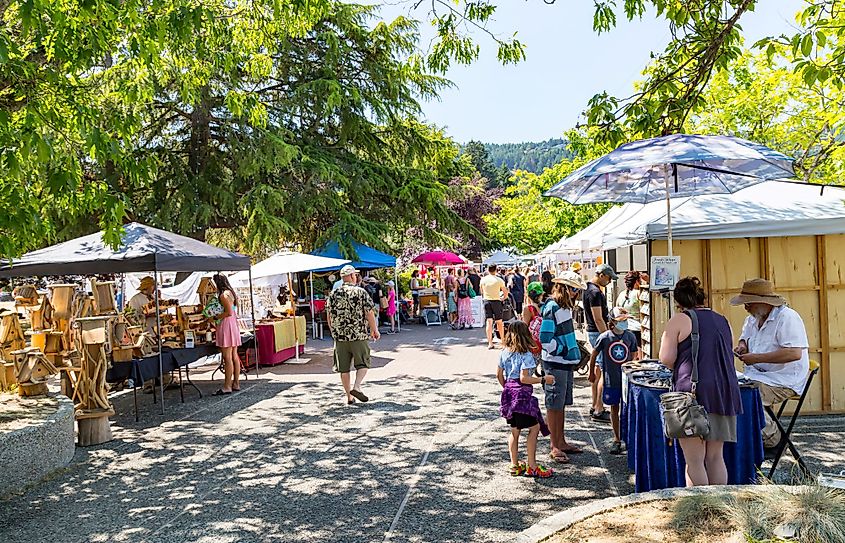 買い物客は、カナダのブリティッシュ コロンビア州ソルト スプリング島のフルフォード ハーバーで開催される人気の土曜ファーマーズ マーケットで商品を物色しています。編集クレジット: rhfletcher / Shutterstock.com