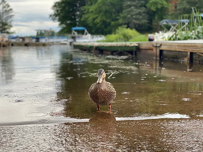 ウィスコンシン州ケーブルのレイクウッズ・リバー・リゾートのナマカゴン湖岸に立つアヒル。