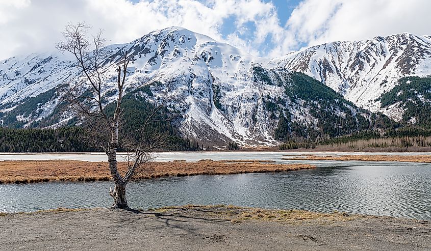 アラスカ州、スワード高速道路とスターリング高速道路の交差点にあるターン湖の端にある木。