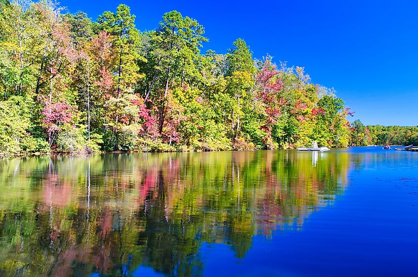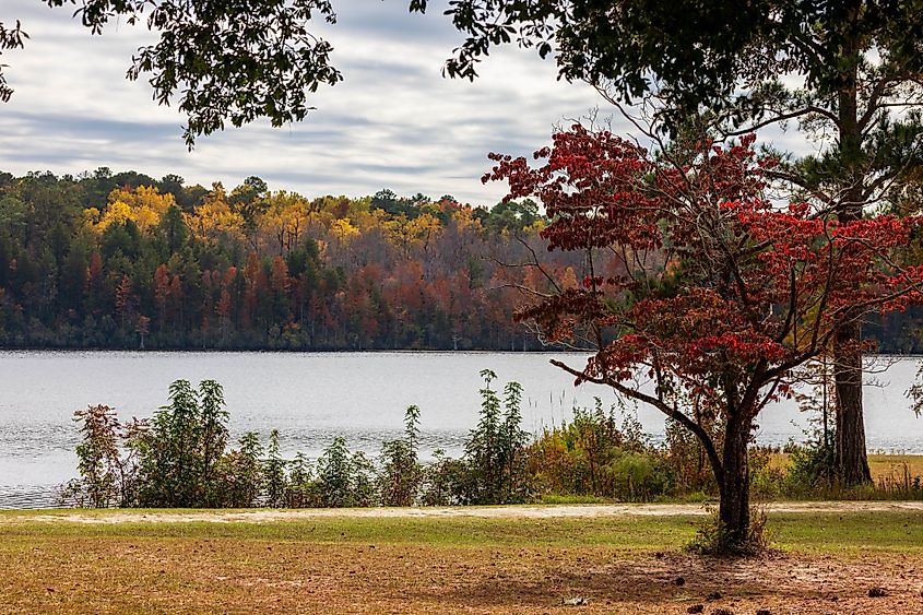透き通った水とジョカシー湖のドラマチックな山の景色で知られるデビルズ フォーク州立公園は、サウスカロライナ州の紅葉の名所の 1 つです。湖のきらめく青と周囲の森の秋の紅葉のコントラストは、特に公園内にある数多くのハイキング コースやボート乗り場から見ると見事です。カヤック、カヌー、ボート ツアーに参加すると、特に人里離れた入り江や入り江に沿って、色とりどりの紅葉を間近で見るユニークな方法が得られます。陸上では、オコニー ベル ネイチャー トレイルなどのハイキング コースが森の中の絵のように美しい小道を提供しており、この公園は紅葉を求める人やアウトドア冒険家に人気の目的地となっています。