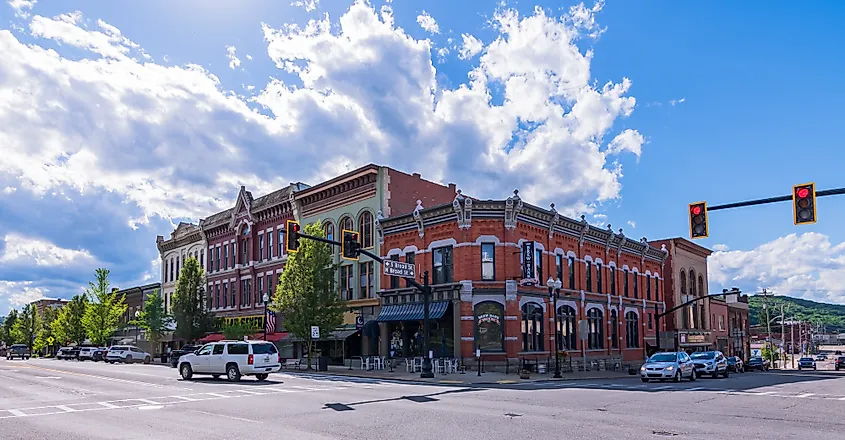 ペンシルバニア州リッジウェイの町のメインストリートに沿って並ぶ素朴な建物。編集クレジット: woodsnorthphoto / Shutterstock.com