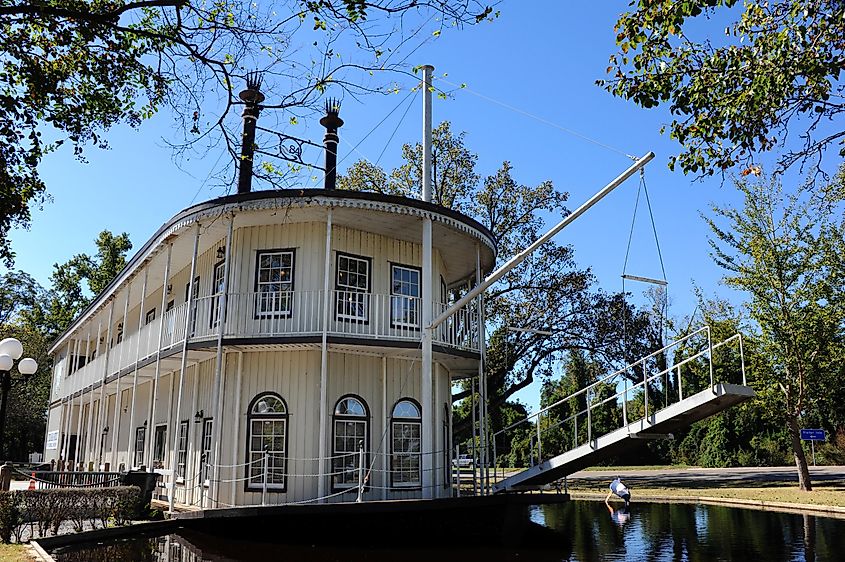 二階建て外輪ボートは、ミシシッピ州グリーンビルのビジター センターとして機能します。