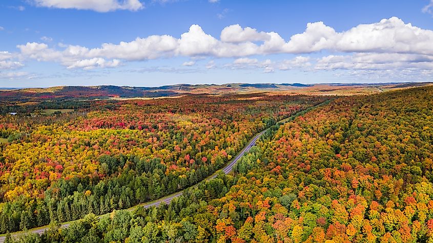 ミシガン州アッパー半島の壮大な秋の風景の中を蛇行する米国国道 2 号線。
