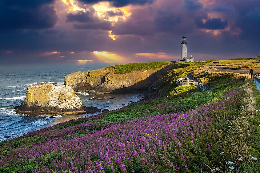 象徴的なヤーキーナ ヘッド灯台は、オレゴン コースト ハイウェイで必見の目的地です。