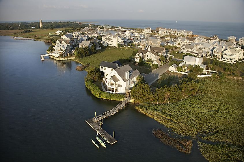 ノースカロライナ州ボールドヘッドアイランドにある沿岸住宅コミュニティの空中景色。