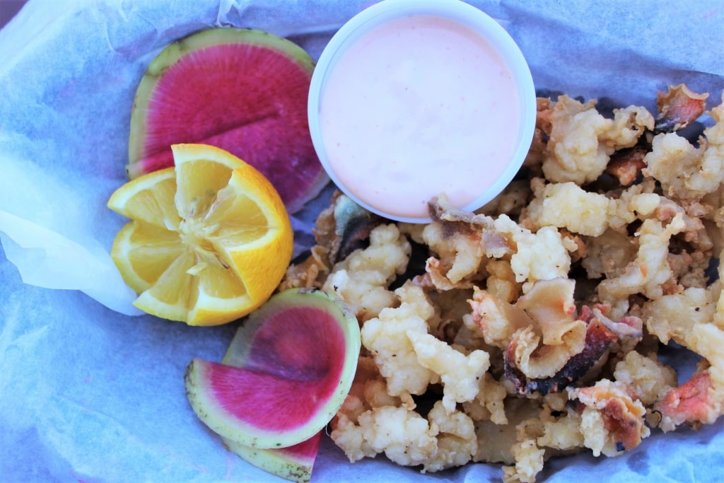 ザ・コンク・リパブリック・シーフード・カンパニーの名物料理は、ひび割れた巻き貝、天ぷらの衣をまぶして軽く揚げた巻き貝、オレンジホースラディッシュ・マーマレードを添えたものです。