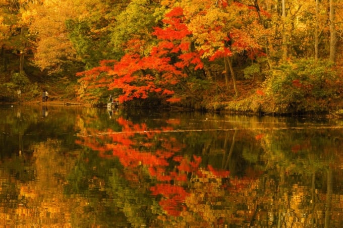 秋の葉の季節は、日本のメープルの木が鮮やかな色に変わる11月中旬から12月上旬まで続きます。湖の表面に明るい色の木を反映すると、息をのむような万華鏡のような視野が生まれます。必ず自分の美しさを訪れて体験してください。