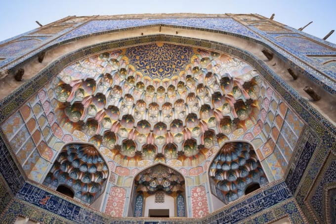 青と白の模様が印象的なブハラのイスラム建築の中でも、アブドゥルアズィズ・ハーン・マドラサの内部は茶色や赤といった暖色系の装飾が特徴的です。