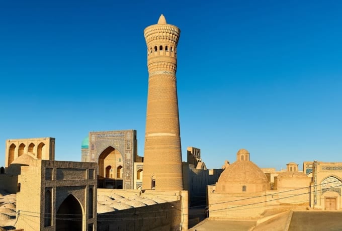 1127 年に建てられたカロン ミナレットは高さ約 48 メートルです。当時のイスラム建築技術の高さがわかります。砂色のカロン・ミナレットが雲ひとつない青空に映えます。頂上に登るとブハラの街を一望でき、写真撮影に最適な観光スポットです。
