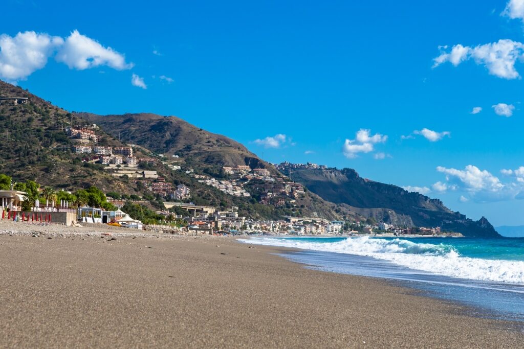 このシチリアのビーチは、タオルミーナ行きのケーブルカーに乗って午後遅くの日差しの下で石畳の通りを散歩する前に、のんびりビーチで 1 日過ごすのに最適です。