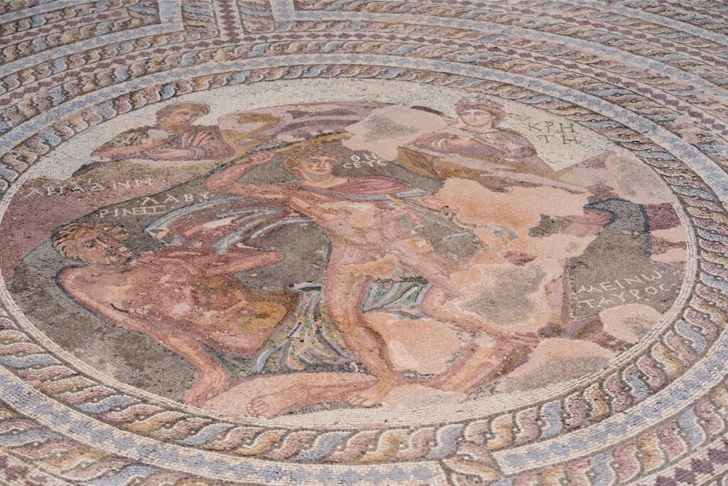 モザイクは驚くほど保存状態が良く、ギリシャ神話の場面が詳細に描かれています。狩猟の画像、神話上の海の怪物スキュラの表現、テセウスとミノタウロスの場面、そしてハウス オブ アイオンでは、ワインの神ディオニュソス、カシオペア、アポロンの絵を描いた詳細なパネルが展示されています。
