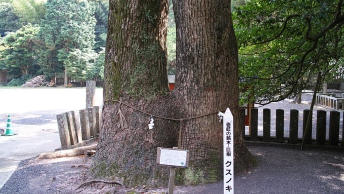 境内には、一本の根から二本の幹が生えるご神木「夫婦楠」がある。