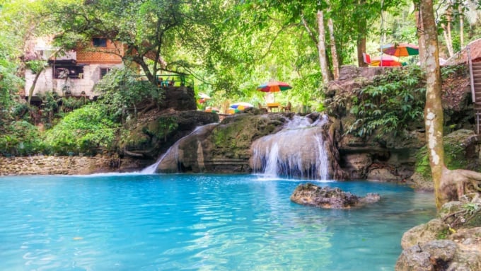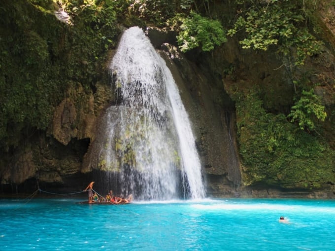 セブで最大の滝であるカワサンフォールズには、塗料のように見える幻想的なプールがあります。クリスタルクリアウォーターは、信じられないほど深い青またはエメラルドグリーンです!