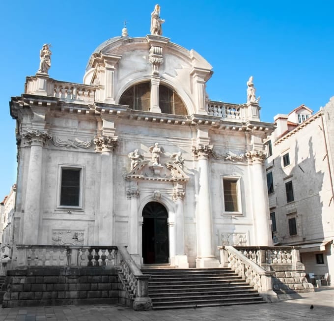 ドゥブロヴニク旧市街のルジャ広場にある聖ブレイズ教会は、独特の青いドームを持つ印象的なバロック様式の建物で、市内で最も人気のあるランドマークの 1 つとなっています。観光客の中心的な集合場所である教会の入り口に続く階段は、休憩をとったり雰囲気を楽しんだりする訪問者で頻繁に占められています。