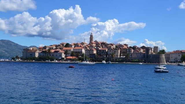 ドブロブニクからフェリーで約 1 時間半のコルチュラ島は、魅力的な旧市街で知られる人気の観光地です。ドブロブニクと同様に、オレンジ色の瓦屋根を備えた伝統的な石造りの建物が特徴で、絵のように静かな雰囲気を作り出しています。