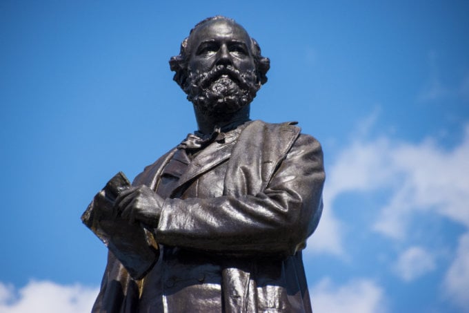 ガーフィールドはクリーブランドの南東の町で生まれ、内戦中に米国陸軍に加わった後、彼は下院の最初の大統領になりました。しかし、彼は1881年に撃たれ、わずか6か月後に亡くなった。この記念碑は、人気のある観光スポットであるレイクビュー墓地にあり、ガーフィールドの像を特徴としています。地下では、ガーフィールドと彼の妻ルクレティアのcoが休むために横たわり、厳soleな雰囲気を作り出します。