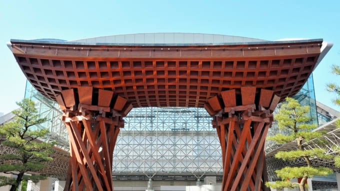 北陸新幹線の開通に伴い、金沢駅はリニューアルされ、観光客の玄関口として人気を集めています。最も目を引くのは、金沢で栄えた伝統芸能である能の太鼓を模した、駅前にある大きな木造建造物「鼓門」です。
