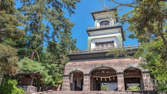 この門は、富岡製糸場(現在は世界遺産)に派遣され、後に金沢にも同様の製糸場を建設した地元の棟梁、津田吉之助が設計したものです。境内には金沢城二の丸にあった東神門や県の名勝に指定されている神苑もあります。尾山神社は賑やかな香林坊商店街の近くにあり、近くでショッピングや食事を楽しむのに簡単に立ち寄ることができます。