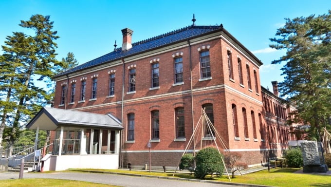 石川四高記念文化交流センターは、現在の大学に相当する四高等学校の旧校舎を利用した施設です。金沢の中心部にひときわひときわ佇む、国の重要文化財に指定されている重厚なレンガ造りの建物。