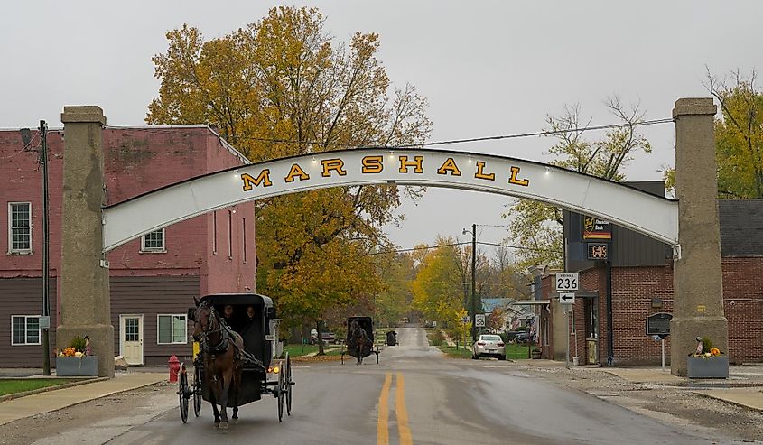 インディアナ州マーシャルのダウンタウンにあるアーチの下にある馬車のアーミッシュバギー。 Shutterstock経由の画像クレジットNagel Photography