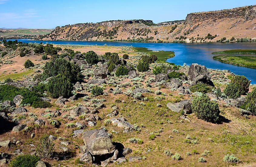 アイダホ州アメリカンフォールズの町の近くの虐殺ロック州立公園の風光明媚な風景。