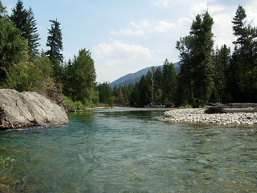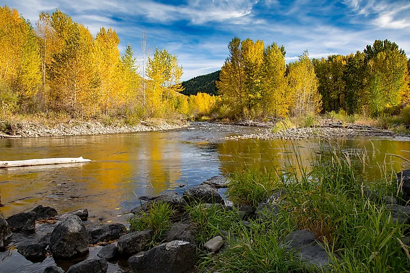 アイダホ州ケッチャム近くのビッグ ウッド リバー。全長 137 マイルのマラド川の支流で、最終的にはスネーク川とコロンビア川に合流します。