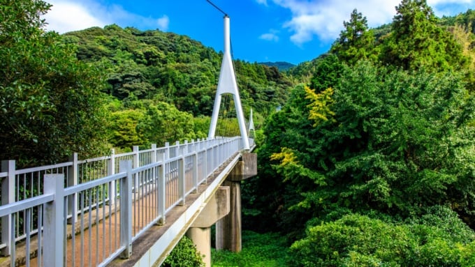 全長100メートルの加茂ゆらりんこ橋は、日本最長の単線吊り橋です。紅葉の名所、二条峡の入り口に位置します。橋から遊歩道を辿ると、美しい秘境の明神の滝に到着します。また、6月上旬からは川沿いでホタルも観察でき、幻想的な夜景が広がります。