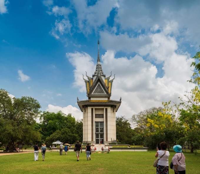 プノンペンの南約 14 km にある大きな記念仏塔は、カンボジアの歴史の中で最も悲劇的な出来事の 1 つであるキリング フィールドの現場を示しています。正式にはチュンエク虐殺センターとして知られるこの場所は、トゥールスレン刑務所の囚人の大量処刑場でした。 20,000 人以上の人々が残忍に殺害され、ここに埋葬されました。目に見える地面のくぼみは、発掘された集団墓地の名残であり、現在でも骨や衣服の破片が時折表面に現れることがあります。