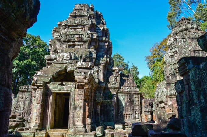 トンレ バティ湖の近くにあるこの寺院は、12 世紀にジャヤヴァルマン 7 世によって建てられました。ヒンドゥー教と仏教の融合で知られています。時間の経過とともに崩壊した部分もありますが、天女や踊り子(デーヴァタ像)を描いた美しい浅浮き彫りが今も残り、石造りの見事な細工が見られます。
