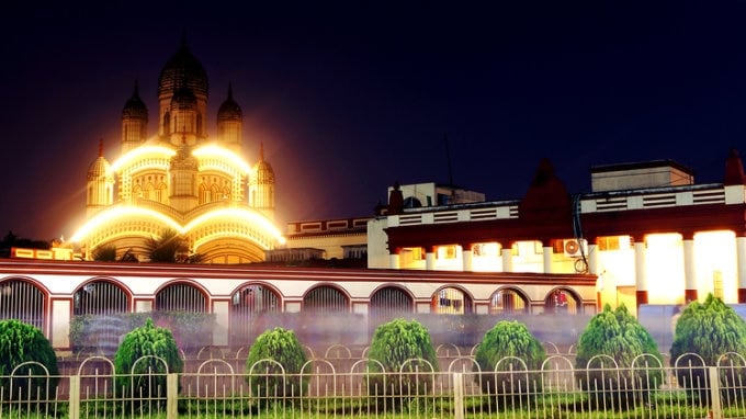 ダクシネーシュワル カーリー寺院は、白い壁に赤い線が入った印象的な寺院で知られ、本堂は 9 つの尖塔を備えた美しいデザインが特徴です。内部にはカーリーの偶像があり、その下には、1,000 個の銀の蓮の花に囲まれた、土下座したシヴァ神の大理石の彫刻があります。