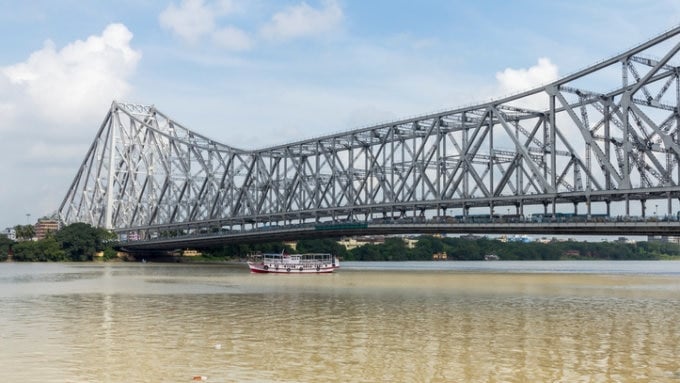 ハウラー橋はコルカタの西側のフーグリー川に架かり、1943 年に建設されました。長さ 705 メートル、高さ 97 メートルの印象的な建造物で、鋼鉄製の頑丈なトラスのデザインが全体的に見られます。力強く力強い印象を与えるブリッジです。そのユニークな特徴の 1 つは、水中に支えがなく、川の両岸のみで支えられていることです。
