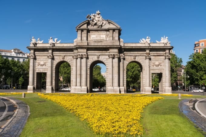 アルカラ門は、その壮大さで知られるマドリードの象徴的なランドマークです。 1770 年代初頭にカルロス 3 世国王の命により、市の東の入り口として建設され、簡素すぎると考えられた以前の門に代わって建てられました。