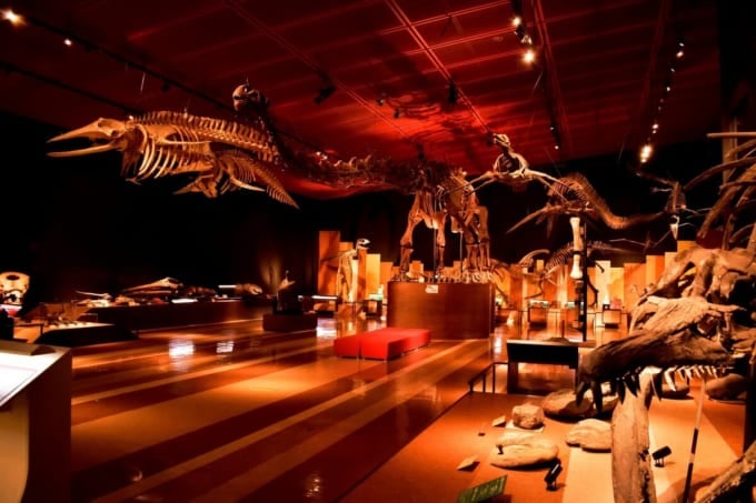 福島県いわき市には、採掘にまつわる2つの重要な歴史的出来事があります。どちらもいわき市石炭・化石館ほるるに展示されています。化石エリアでは、いわき市北部の双葉町で発掘されたフタバサウルスの全身化石レプリカがお出迎え!
