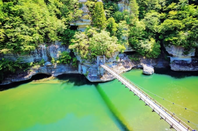 「へつり」とは福島県会津地方の方言で、「川に近い危険な崖」を意味します。阿賀川のほとりの森の中に、塔のような切り立った岩がそびえ立つ奇岩の景勝地です。福島県を代表する自然観光名所のひとつで、会津鉄道の「塔のへつり駅」もあります。 100万年の歳月をかけて川の浸食によって形成された貴重な景観は、国の天然記念物に指定されています。
