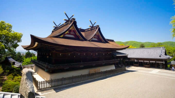 吉備津神社は岡山県にあります。古代、岡山一帯は「吉備の国」と呼ばれ、吉備津神社は吉備分割の際にできた領土の一つである備中国の最高位の神社です。地元のお土産「きびだんご」も有名です。 (※桃太郎昔話に登場するきびだんごはこれをモデルとしていますが、関係はありません。)