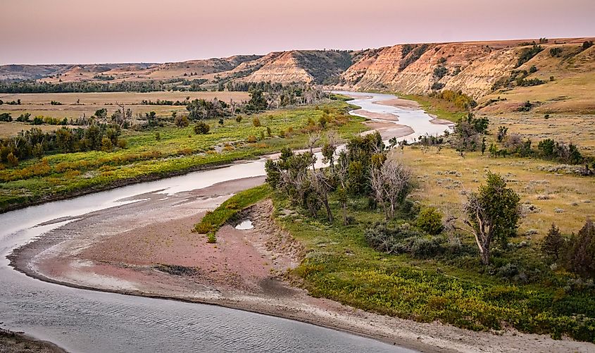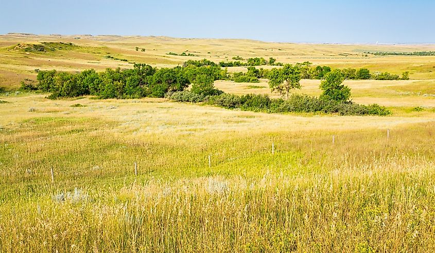 リトル ミズーリ国営草原は 100 万エーカー以上の広さがあり、米国最大の国営草原です。雑草が混じる草原の広大な風景は、何百万年にもわたって風と水によって削られた印象的な荒地によって形作られています。リトル ミズーリ川は起伏の多い地形を曲がりくねって流れ、州の最高点であるホワイト ビュートは州の南東の隅にそびえ立っています。草原に囲まれたセオドア ルーズベルト国立公園は、景観と生態学的豊かさをさらに高めています。