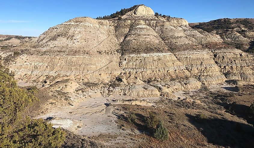 海抜 3,506 フィートのホワイト ビュートは、ノースダコタ州で最も高い自然の地点です。険しいバッドランズ内のスロープ郡に位置するこの印象的なビュートは、ハイカーにリトル ミズーリ国立草原の広大な景色を眺めながら頂上までの往復 4 マイルの旅を提供します。この場所はデニス一家によって私有されており、彼らはこのエリアを管理しており、維持を助けるために訪問者に少額の寄付を求めています。