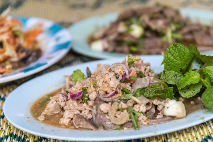 サラダと誤訳されることが多いラーブは、さまざまな新鮮なハーブ、スパイス、肉(通常はミンチ)で作られます。伝統的に生で食べるのが一般的ですが、さまざまな健康リスクを考慮して、最近ではほとんどの業者が炒めてから提供しています。サラダと呼ぶには無理があるかもしれないが、豊富なハーブと軽く揚げたひき肉のおかげで、比較的ヘルシーな選択肢となっている。