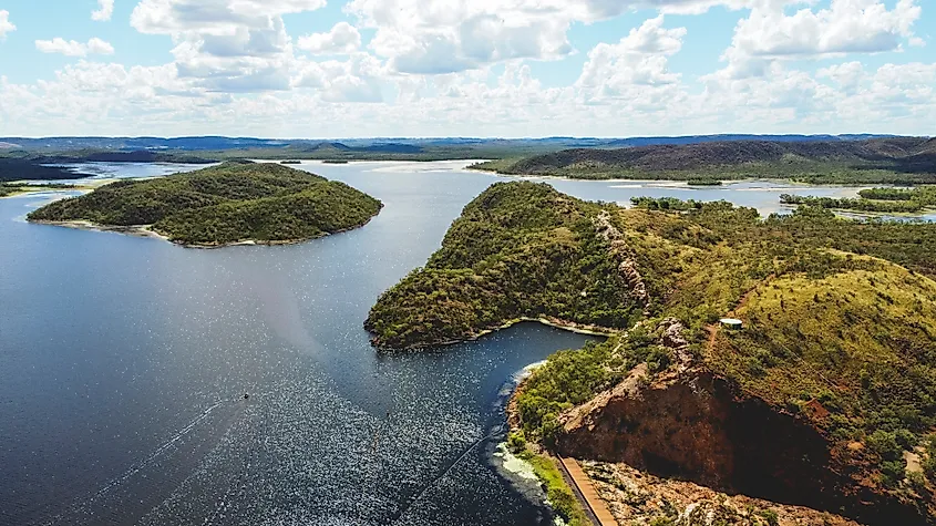 クイーンズランド州のイサ山の近くでは、ムーンダラ湖は劇的なヘビの出会いで有名です。オリーブパイソン(Liasis olivaceus)の本拠地です。これは、長さ13フィート(4メートル)を超える可能性のある大規模な非寛容な収縮器です。光沢のあるオリーブブラウンの色と淡い腹部で、ヘビは浅い水での狩猟によく適合しています。オリーブのピソンは魚、鳥、爬虫類を食べ、モンダラ湖は2014年に圧倒的な淡水ワニを飲み込んだ後、有名になりました。海岸線の近くで日光浴や湖を泳いでいるこれらの強力なヘビの光景は、「ヘビ湖」としての評判を固めています。