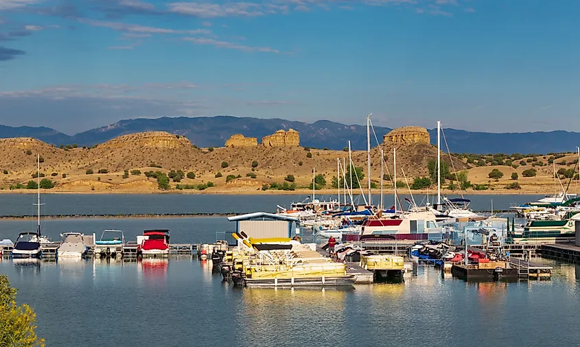 コロラド州のボイドレイク州立公園の国境内にあるボイド湖は、水ベースのレクリエーションに人気のある場所です。明るい青色の水域は1,747エーカーに及び、ウォータースキー、ウェイクボード、ジェットスキー、カヌー、ボート、水泳などの機会を提供します。湖とその周辺では、訪問者はガーターと雄牛の両方のヘビを見つける可能性があります。後者はガラガラヘビを模倣するために尾を揺さぶり、尾を振っていますが、実際にはかなり無害です。模倣は潜在的な捕食者を怖がらせることを目的としていますが、多くの場合、雄牛のヘビは人間から逃げることを選択します。
