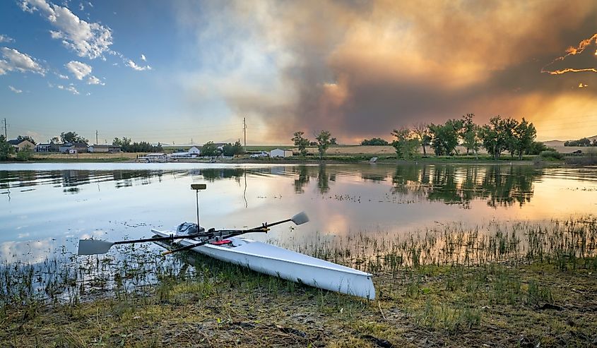 コロラド州ラブランド近くのボイド湖の海岸でrowぎた貝殻は、日没時に見られるアレクサンダーマウンテンの火から煙の羽毛を備えています。