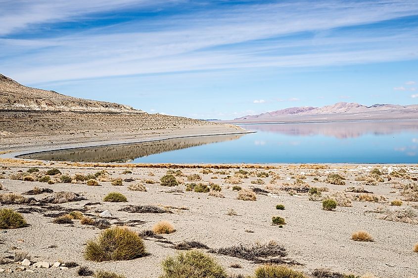 ネバダ州西部のホーソーン近くに位置するウォーカー湖は、最大 50 平方マイル (130 平方キロメートル) にも及ぶ大きな自然湖で、州の内陸盆地の顕著な例となっています。この海域には、ラホンタンのカットスロートラウトを探す釣り人や、静かな海岸線に沿ってボート遊びやキャンプを楽しむアウトドア愛好家が集まります。そびえ立つ砂漠の山々が盆地を取り囲み、湖の独特の地形を際立たせる険しい背景を作り出しています。