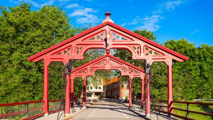 もともとこの橋は跳ね橋として機能していましたが、現在は人気の観光スポットになっています。入り口の赤い門にはトロンヘイムの伝統的な彫刻が施されており、おとぎ話のような雰囲気を醸し出しています。この門は「幸福の門」とも呼ばれ、ここでキスをしたカップルは永遠の愛を保つことができるという地元の言い伝えがあります。