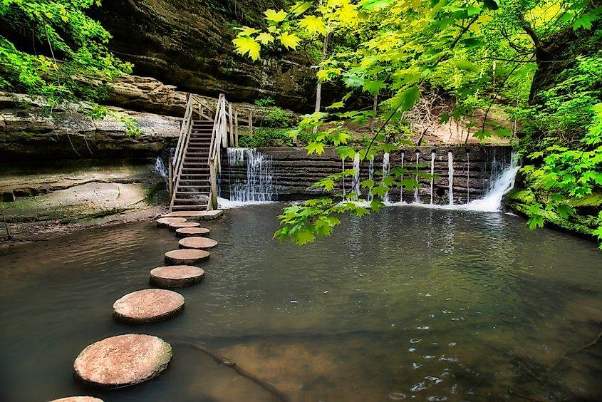 約2,630エーカーをカバーするこの公園は、数千年前に氷河のメルトウォーターによって形成された深い砂岩の峡谷で最もよく知られています。実際、セントルイス、ワイルドキャット、フレンチキャニオンを含む18の峡谷には、春や大雨の後に最も強く流れる季節の滝があります。