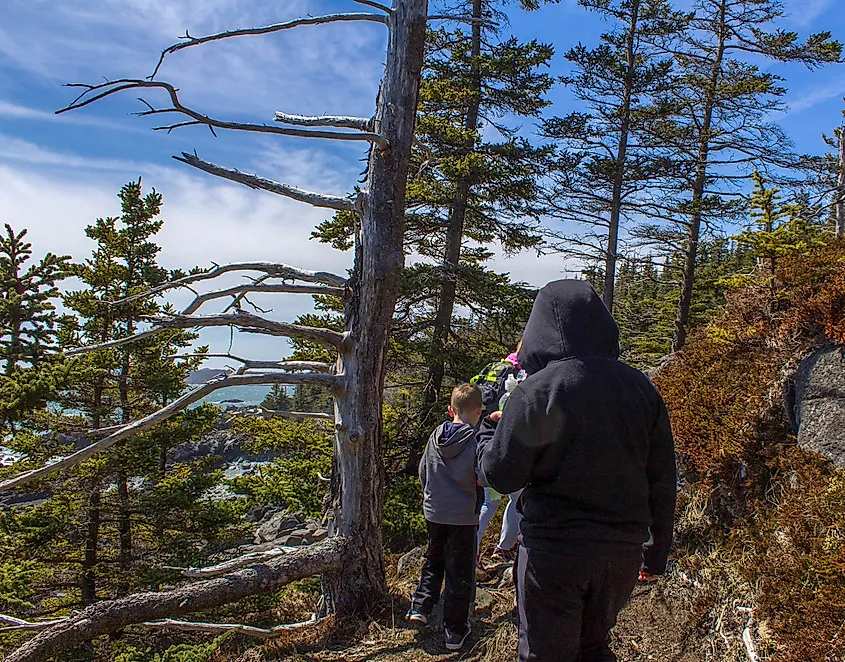 メイン州のクオディ・ヘッド州立公園でハイキングをする人々。