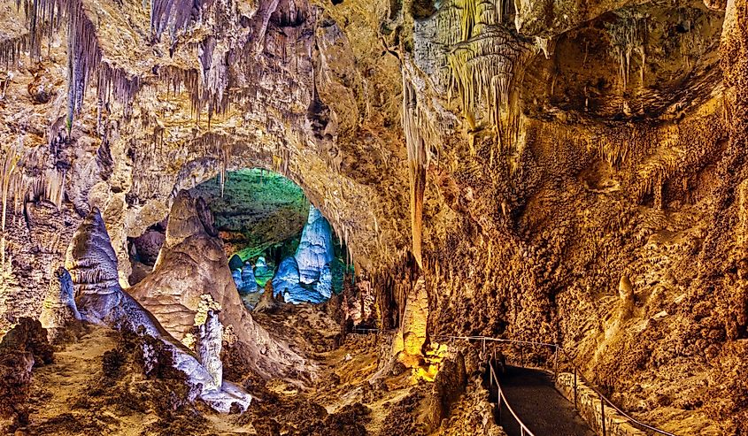 カールズバッド洞窟国立公園には、既知の洞窟が 119 以上あります。これらの洞窟は主に硫酸によって周囲の石灰岩が地下で溶解されて形成されています。目玉はもちろんカールズバッド洞窟そのもので、その中には北米最大の単一の洞窟部屋であるビッグ ルームがあり、その長さは約 4,000 フィート、最も高い部分の高さは 255 フィートです。