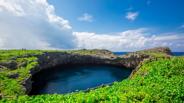 伊良部島から西海岸に沿って進み、下地島の南部にある通り池がある下地島へ向かいます。この大きな双子の池は、深いコバルトブルーの色と神秘的な姿で有名です。池の周囲は木柵や遊歩道が整備され、安全に美しい自然景観を楽しめるよう整備されています。 「通り池」という名前は、二つの池が地下でつながっており、独特の自然現象を生み出していることに由来しています。